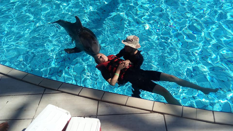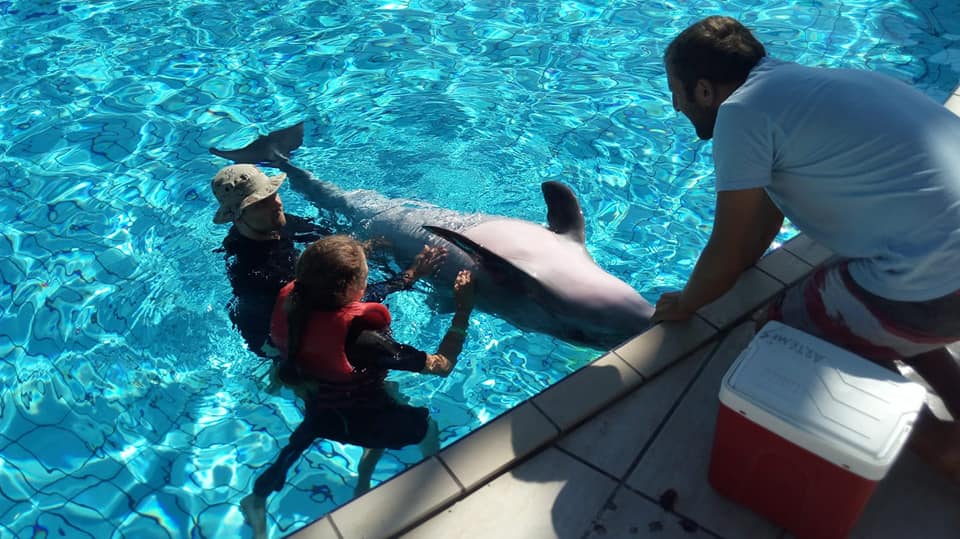 Dodatkowe zaangażowanie ze strony trenerów było widać po sesjach. Po show (będącym stałym elementem każdego turnusu delfinoterapii) mieliśmy okazję dotknąć delfiny (dwa!) i zrobić sobie z nimi zdjęcia. Natomiast kończąca turnus sesja rodzinna odbyła się nie, jak to zawsze bywało, na małym basenie z jednym delfinem, ale z trzema na show pool (dużym basenie służącym do pokazów)! 😀 Była to moja najlepsza sesja rodzinna w mojej dotychczasowej karierze jako delfinoterapeuta 🙂