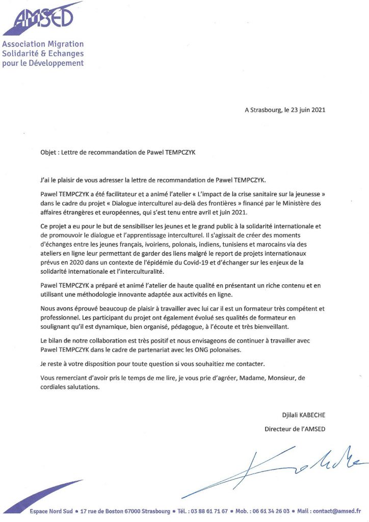 Leading activities in English wasn’t something new for me but translating it into French seems quite a challenge 🙂 So I was grateful to have Lidia to help me with summary of my speech in French. My webinar was appreciated by particinants as stated in the Letter of Recommendation issued by the AMSED’ Head of organisation Djilali Kabeche: „Pawel TEMPCZYK prepared and facilitated the workshop with high quality, rich content and an innovative methodology adapted to online activities. We enjoyed working with him because he is a very competent and professional trainer. The participants of the project also shaped his pedagogical qualities by underlining his ability to be dynamic, well organized, a good listener and incredibly benevolent. „