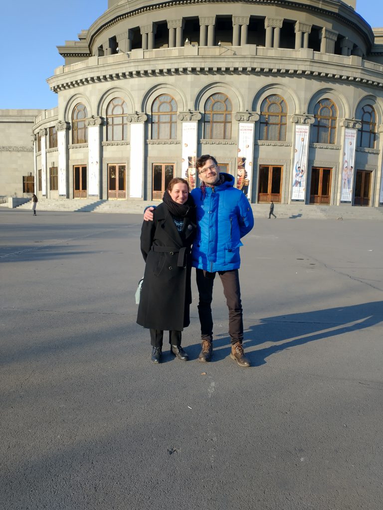 This was my first Erasmus Plus project in 2022. I was thinking for a long time about joining a project in Yerevan because I wanted to have a reunion with my dear friend from Syria – Varty Kouyoumjian whom I had met in Kyiv already 7 years ago! This is us in front of the Opera before the project has started: