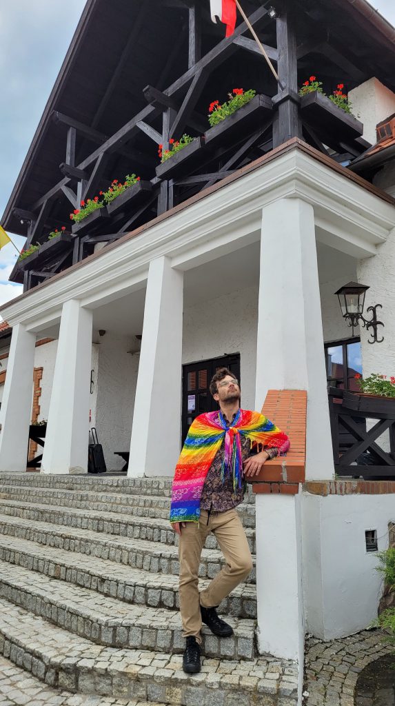 Natomiast dwa dni temu w ramach Fun Hunters prowadziliśmy po angielsku na Mazurach teambuilding dla kilkudziesięciu pracowników P&G – w ramach tego wcieliłem się w rolę guru duchowego Jonasza (co nie było takie trudne, zważywszy na moje doświadczenia związane z jogą śmiechu i niektórymi jej uduchowionymi liderami 😉 ). Moim zadaniem było „zachęcanie” uczestników do wzięcia udziału w tak zwanym „masażu emocjami”, czyli czerpaniu energii ze słońca przy wdechu, a przy wydechu wyzbywaniu się całej negatywnej energii z ciała; najlepiej, gdyby jeszcze być uziemionym bez butów na trawie, a buty oddać w donacji dla naszej Fundacji EzoMezo. Oczywiście była to rola do odegrania, mocno przerysowana, co nie zmienia faktu, że niektórzy uwierzyli w to i rzeczywiście myśleli, że jestem ezo-frikiem 😀 Stylizacja oczywiście została odpowiednio dobrana do roli (na zdjęciu w tęczowej chuście w słoniki przywiezionej dla mnie z Tajlandii przez moją znajomą):
