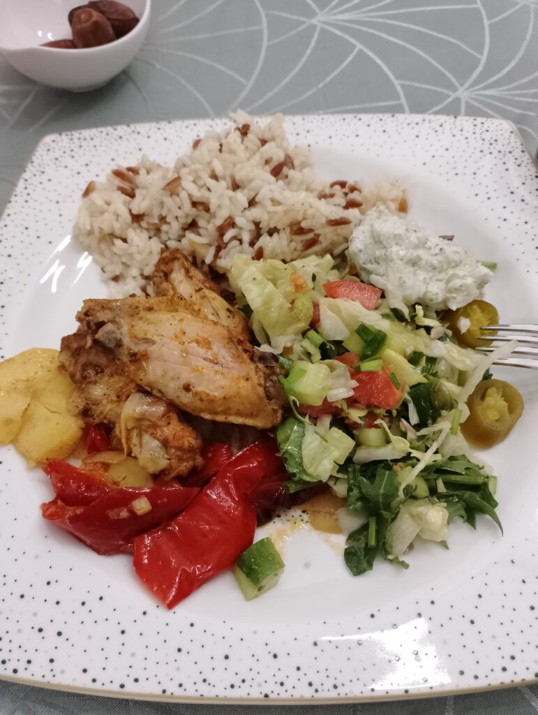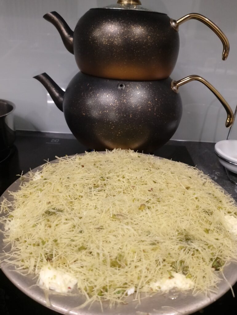 do ich nowego domu w Raszynie. W tegorocznej kolacji Iftar uczestniczył też mój znajomy Ilkay Karabacak – podobnie jak w zeszłorocznej (wpis do przeczytania tutaj). Podczas kolacji rozmawialiśmy o studiach (Elif studiowała w Polsce – ukończyła Polsko-Japońską Akademię Technik Komputerowych), różnicach kulturowych między naszymi krajami, trochę (ale nie za dużo) o polityce itp. Chciałbym też napisać kilka słów, czym zostaliśmy ugoszczeni – zaczęliśmy od tureckiej zupy z soczewicy, następnie danie główne – kurczak, ryż, sałata, a jeśli ktoś miał ochotę, też ostre papryczki (kiedyś jak pracowałem w Turcji wydawały mi się za ostre, ale potem przyzwyczaiłem się do nich i nie wyobrażam sobie teraz tureckiego posiłku bez nich 😀 ). Największe wrażenie zrobił na mnie tradycyjny, przyrządzony przez gospodarza deser künefe, przygotowany z mącznych niteczek wyglądający jak makaron ryżowy, z pistacjami i mozarellą pokrojoną w kawałki (niestety typowy turecki ser używany do tego deseru jest niedostępny w Polsce, dlatego też używają innego sera „bez smaku” – jak to określiła gospodyni 🙂 ), na blaszy wysmarowanej masłem, polane słodkim syropem i upieczone aż do kruchości: