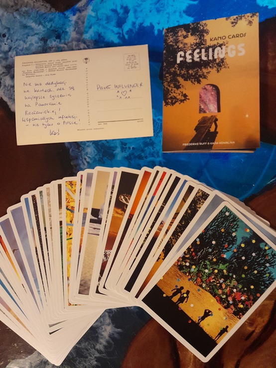 Wracając do kart – zestaw składa się z trzydziestu pięciu kart wykonanych w formie kolaży przez graficzkę Friederike Ruff oraz książeczki napisanej przez Kasię Kowalską. W skład zestawu nie wchodzi jeszcze kartka z dedykacją od autorki, ale ja taką otrzymałem 🙂 Z książeczki możemy się dowiedzieć, że pomysł na karty powstał w pewien zimny, deszczowy październikowy wieczór, książeczka tłumaczy również, jak prezentować karty (pięć rzędów po siedem kart, albo siedem rzędów po pięć kart, czyli nie tak jak w tarocie). Karty mają służyć trenerom i terapeutom jako zachęta do podzielenia się, jak uczestnicy/ klienci się czują, z czym przychodzą itp. (karty nie mają celu terapeutycznego czy diagnostycznego). Jest również opisane, jak wykorzystać te karty w odniesieniu do swojej „podróży przez życie”; jedyne, czego nie udało mi się wyczytać, to skąd się wzięła nazwa KANO. 😀