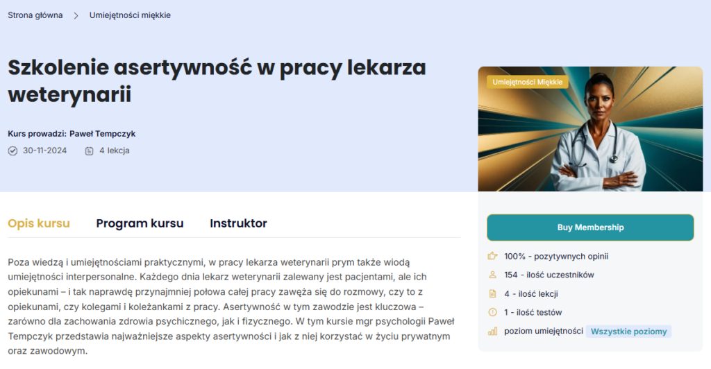 Na pierwszy ogień poszła asertywność, jako umiejętność często niedoceniana nawet w zawodach medycznych. W pierwszym webinarze omówiłem, czym jest asertywność i jak mogą wyglądać relacje asertywne/ agresywne między lekarzem weterynarii a klientem. Drugi webinar dotyczył pracy z przekonaniami (pro- i antyasertywnymi) oraz praw asertywności, trzeci zaś – udzielania oraz reagowania na krytykę, zarówno sformułowaną asertywnie, jak i nie. Podczas czwartego webinaru przedstawiłem techniki: komunikat ja, komunikat FU(K)O, cztery kroki reakcji asertywnej wg Pameli Butler. Piąty, ostatni webinar obejmował sposoby wprowadzania asertywności w życie – rozpoczął się mapą asertywności wg Marii Król-Fijewskiej, w środkowej części nagrania omówiłem dzienniczek asertywności, zaś w ostatniej – technikę coachingową Linia życia.