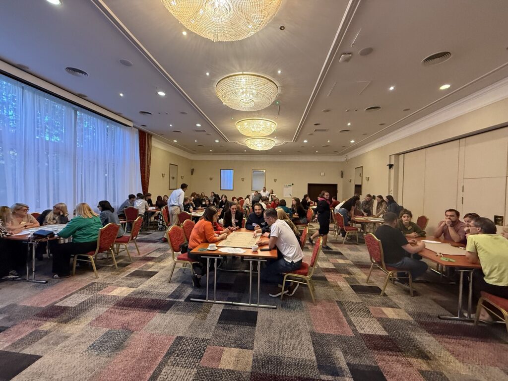 W wydarzeniu wzięło udział około siedemdziesięciu uczestników z obu sektorów – organizacji pozarządowych oraz przedstawicieli edukacji formalnej. Rozpoczęliśmy wspólnym obiadem w hotelowej restauracji, po którym odbyła się prowadzona sesja networkingowa – prowadzona czyli podzielona na stoły, przy których można było rozmawiać na zadane tematy. Przy jednym z nich mogłem opowiedzieć o rezultatach ostatniego projektu Fundacji Wspierania Dialogu Rozmawiajmy zorganizowanego w ramach KA2, czyli DEMOS – Democracy Dialogues (opracowywałem raport na potrzeby tego projektu, uczestniczyłem w spotkaniu w Helsinkach oraz w kursie na facylitatora dialogów DEMOS). Jako rezultaty projektu na stronie dostępne są: raporty o stanie demokracji w Europie w kilku językach, karty DEMOS ułatwiające prowadzenie sesji oraz podręcznik, zachęcam więc do odwiedzenia strony www.democracydialogues.eu. Wieczorem zapewniono nam rozrywki – DJa puszczającego hity z zeszłego tysiąclecia, dwa tory kręgli, cymbergaj oraz winne wsparcie, nie mogę narzekać, że było nudno 😉