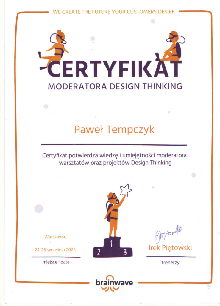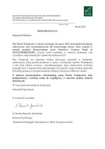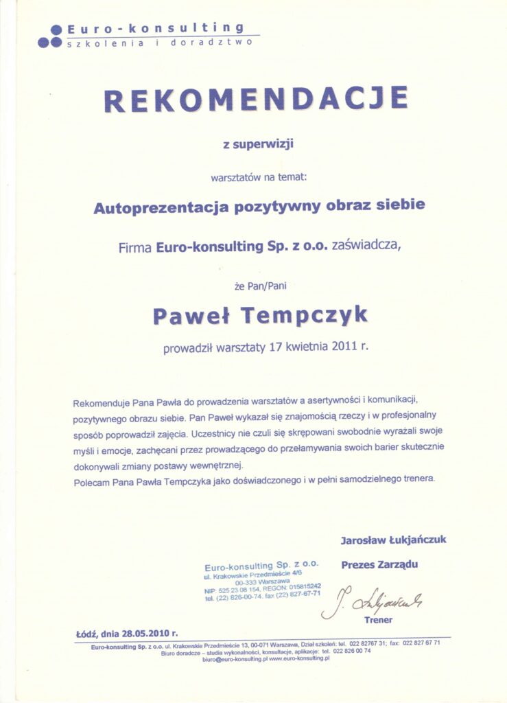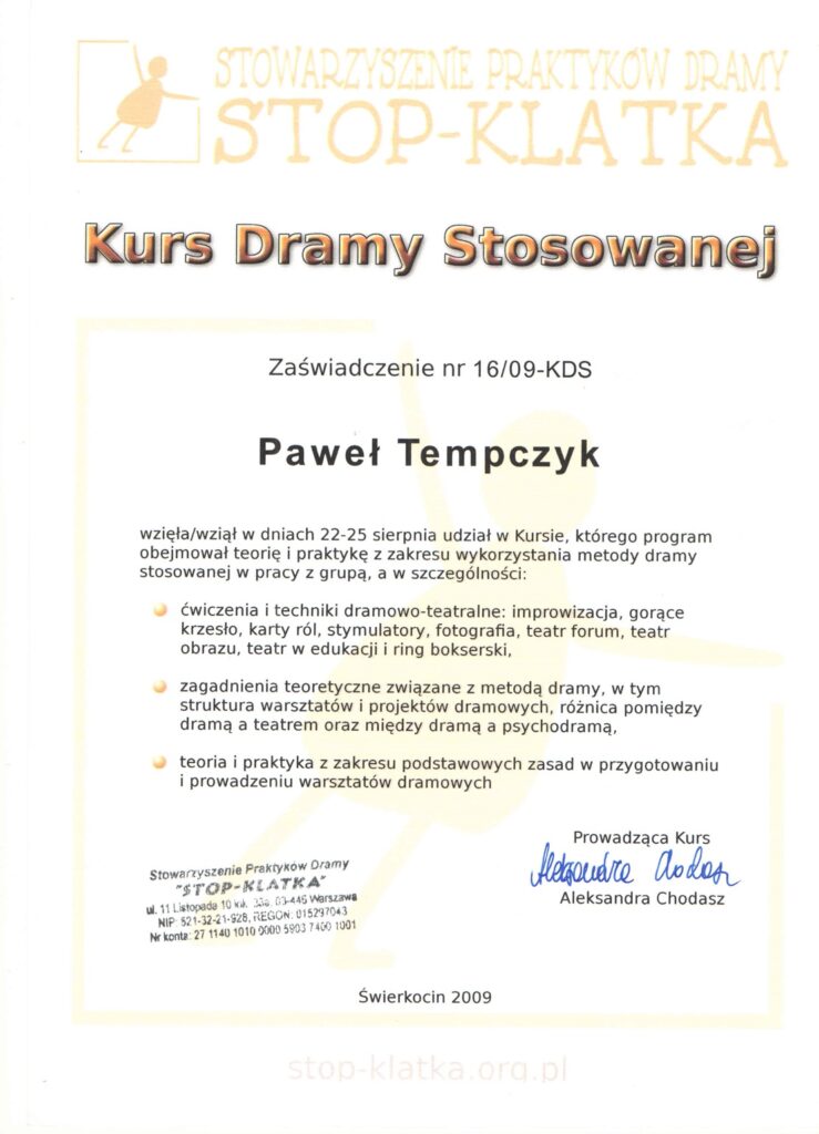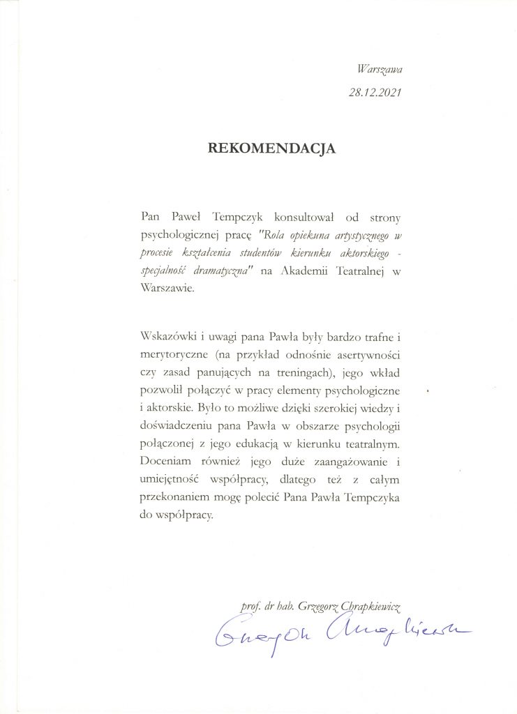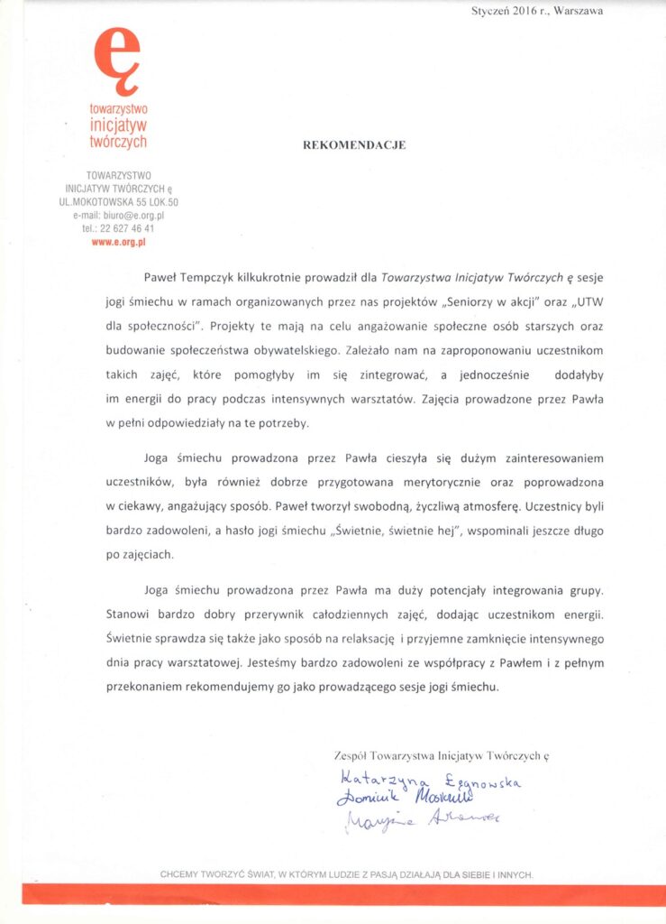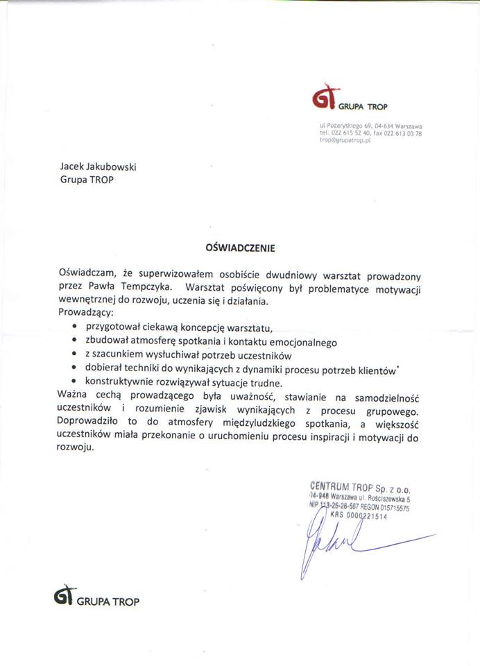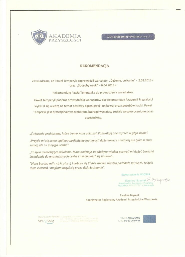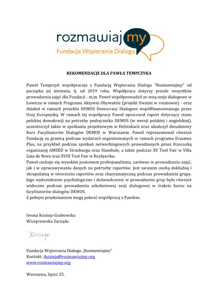 Wybrane rekomendacje Łukasz Rodek – Fundacja Kronenberga przy CITI Handlowym Jarosław Łukjańczuk – Euro-konsulting Ewelina Bzymek – Stowarzyszenie WIOSNA Zespół Towarzystwa Inicjatyw Twórczych Ę dr Oksana Dąbrowska – Fundacja Dobra Wioska Joanna Piotrowska – BlaBlaCar Jacek Jakubowski – Grupa TROP Joanna Piotrowska – BlaBlaCar Jacek Wnorowski – Red8 Events Artur Winnik – Mal-Win Bis dr Natalia Banasik-Jemielniak – Akademia Pedagogiki Specjalnej Djilali Kabeche – AMSED (Association Migration Solidarite et Echanges pour le Developpement) prof. dr hab. Łukasz Sułkowski – PCG Polska prof. dr hab. Grzegorz Chrapkiewicz – Akademia Teatralna dr hab. Zbigniew Kadłubek – Biblioteka Śląska dr Małgorzata Foryś-Nogala – Akademia Ekonomiczno-Humanistyczna Kancelaria Doradcza Progressio – Przemysław Kuderczak Pomiędzy Słowami – Grzegorz Tomaszewski Fundacja Wspierania Dialogu „Rozmawiajmy” – Wiceprezeska Iwona Kozieja-Grabowska Wybrane certyfikaty Kurs Dramy Stosowanej – Stowarzyszenie Praktyków Dramy STOP-KLATKA Kurs coachingu grupowego – Grupa TROP Kurs liderów jogi śmiechu – Laughter Yoga International Kurs diagnostów PERSO.IN Bootcamp Data Science – kodołamacz.pl Kurs moderatorów Design Thinking – Irek Piętowski