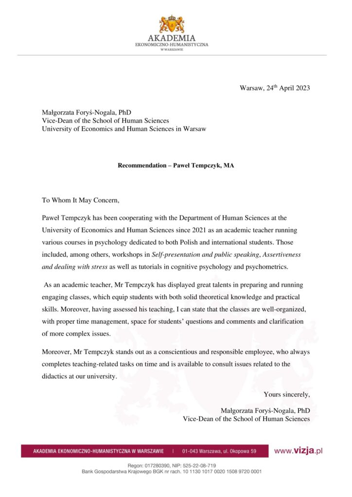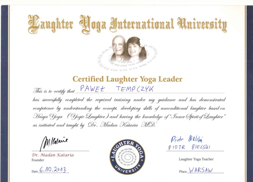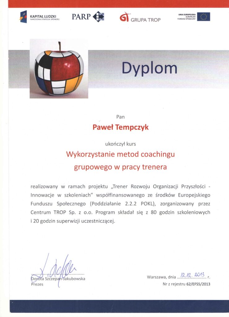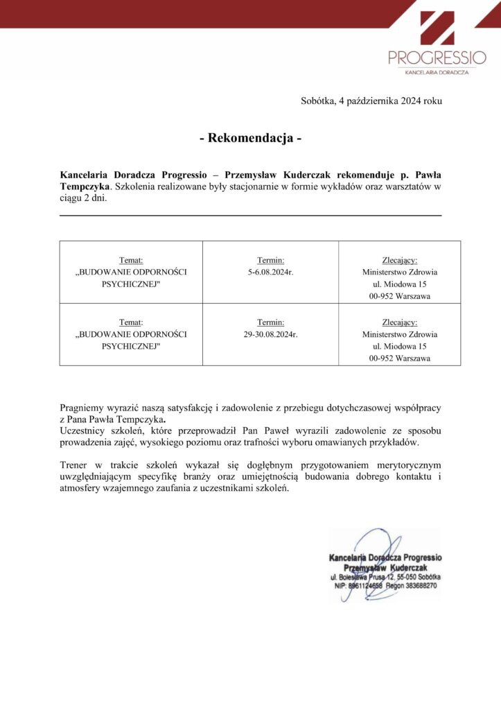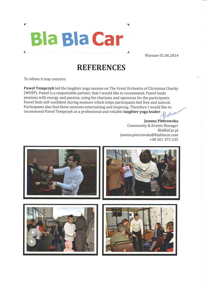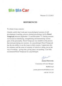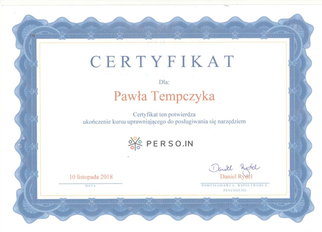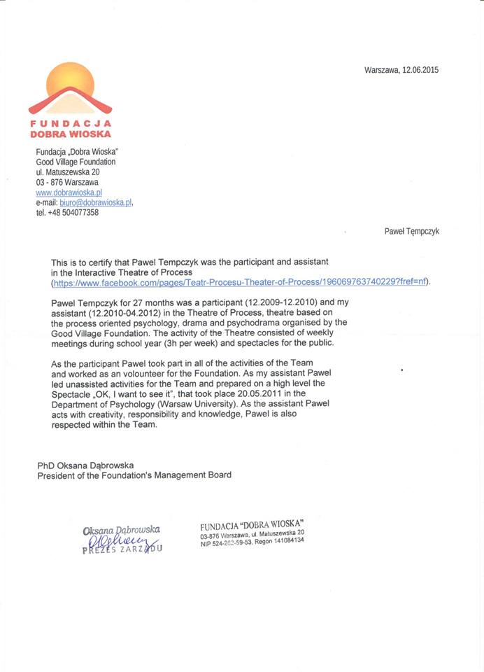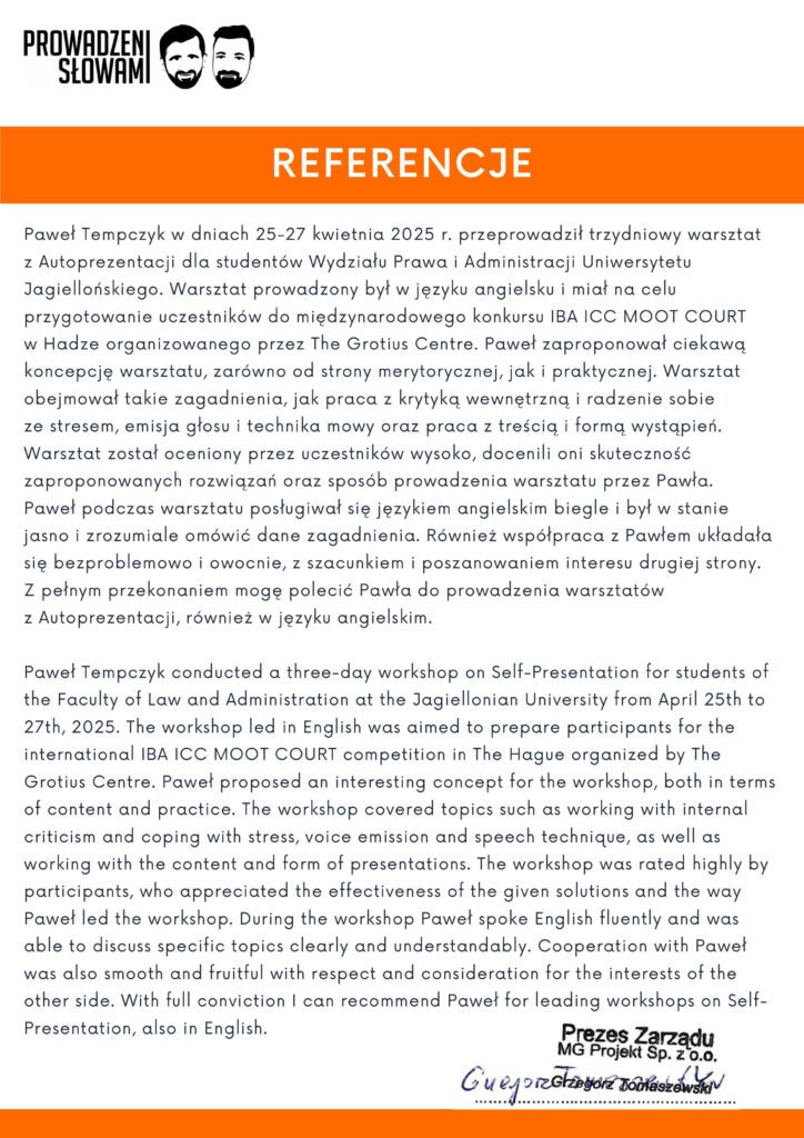 Wybrane rekomendacje Łukasz Rodek – Fundacja Kronenberga przy CITI Handlowym Jarosław Łukjańczuk – Euro-konsulting Ewelina Bzymek – Stowarzyszenie WIOSNA Zespół Towarzystwa Inicjatyw Twórczych Ę dr Oksana Dąbrowska – Fundacja Dobra Wioska Joanna Piotrowska – BlaBlaCar Jacek Jakubowski – Grupa TROP Joanna Piotrowska – BlaBlaCar Jacek Wnorowski – Red8 Events Artur Winnik – Mal-Win Bis dr Natalia Banasik-Jemielniak – Akademia Pedagogiki Specjalnej Djilali Kabeche – AMSED (Association Migration Solidarite et Echanges pour le Developpement) prof. dr hab. Łukasz Sułkowski – PCG Polska prof. dr hab. Grzegorz Chrapkiewicz – Akademia Teatralna dr hab. Zbigniew Kadłubek – Biblioteka Śląska dr Małgorzata Foryś-Nogala – Akademia Ekonomiczno-Humanistyczna Kancelaria Doradcza Progressio – Przemysław Kuderczak Pomiędzy Słowami – Grzegorz Tomaszewski Fundacja Wspierania Dialogu „Rozmawiajmy” – Wiceprezeska Iwona Kozieja-Grabowska Wybrane certyfikaty Kurs Dramy Stosowanej – Stowarzyszenie Praktyków Dramy STOP-KLATKA Kurs coachingu grupowego – Grupa TROP Kurs liderów jogi śmiechu – Laughter Yoga International Kurs diagnostów PERSO.IN Bootcamp Data Science – kodołamacz.pl Kurs moderatorów Design Thinking – Irek Piętowski