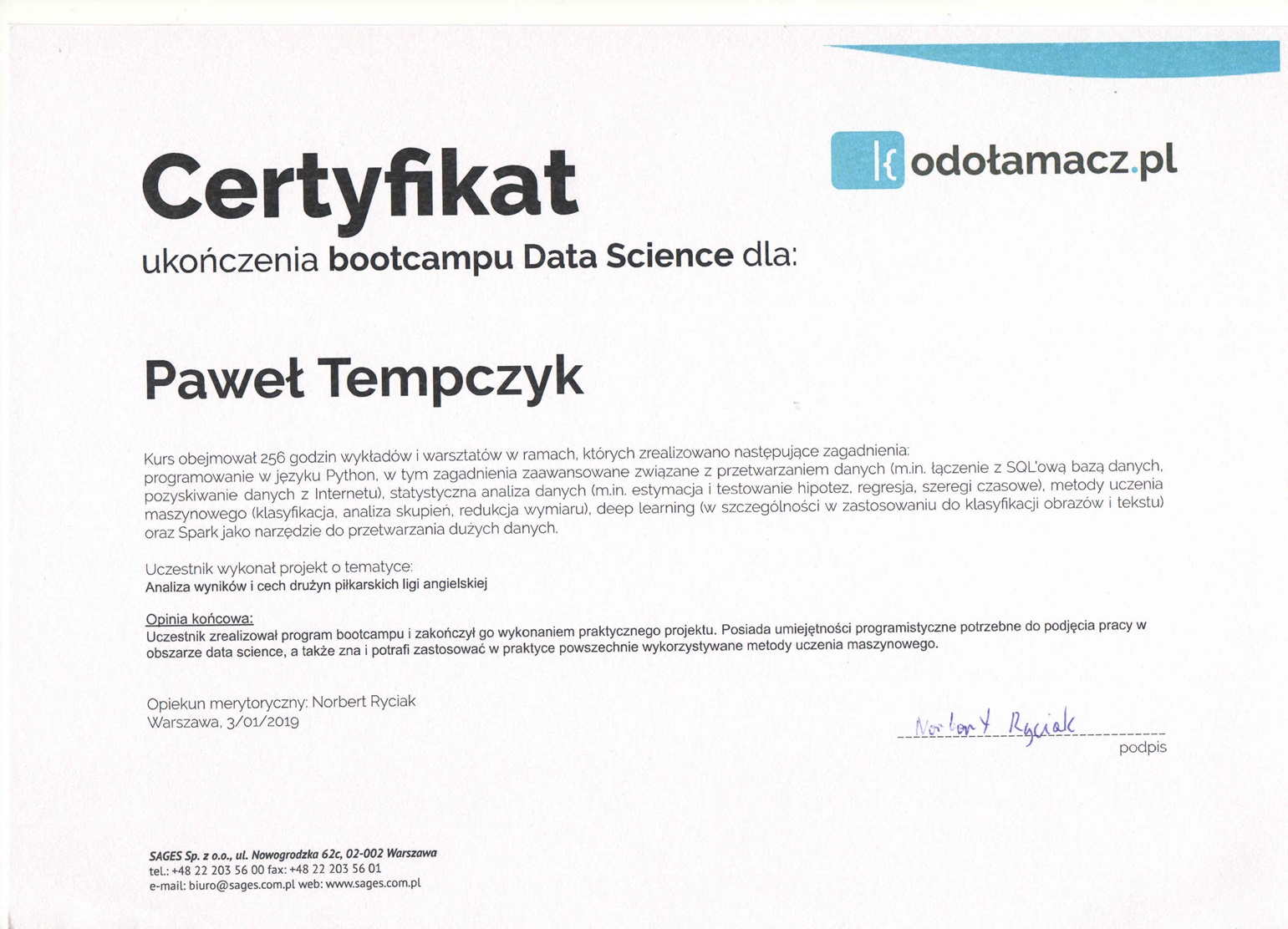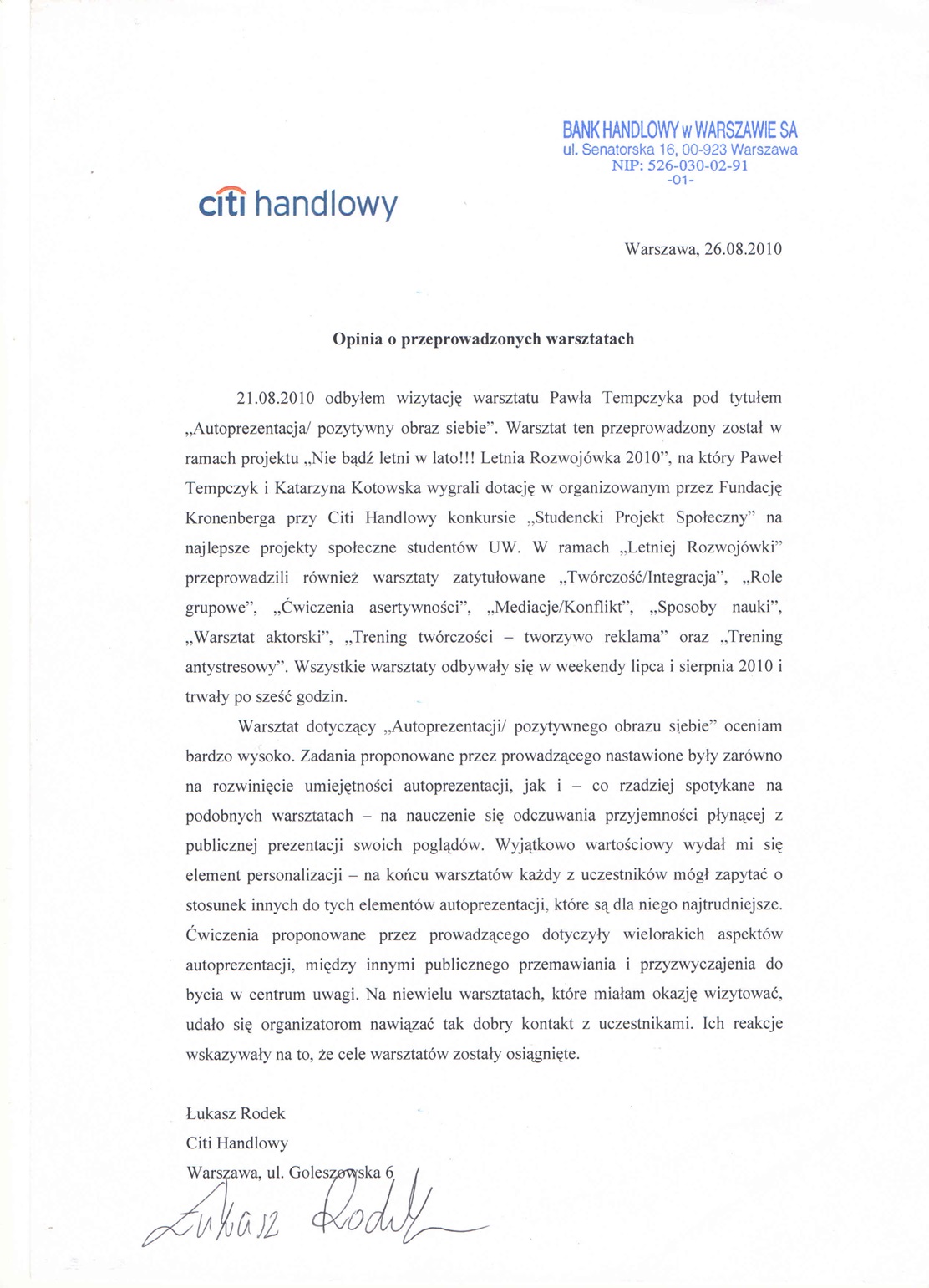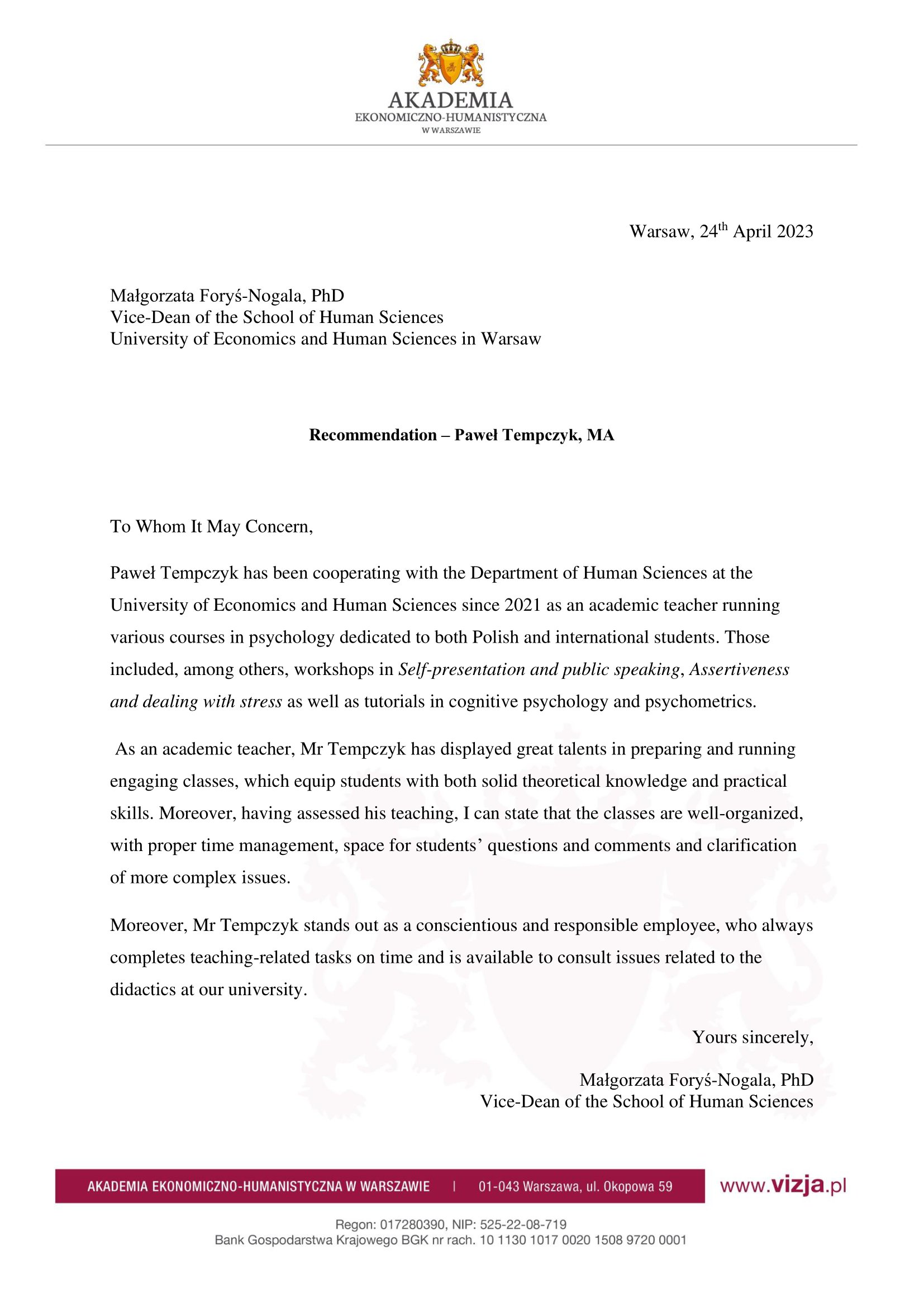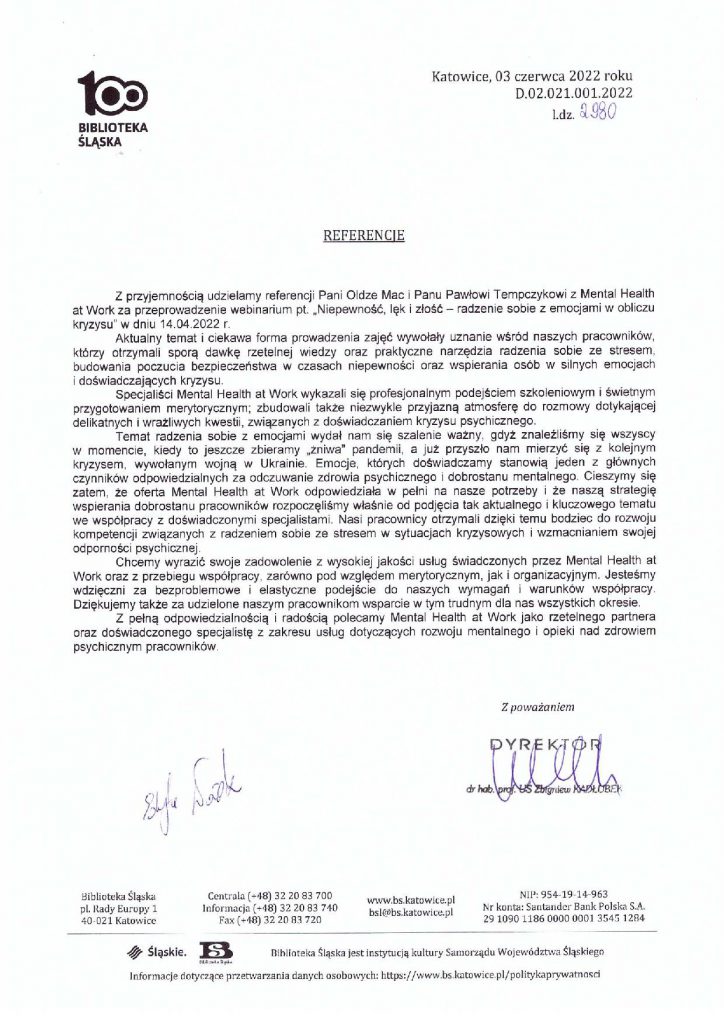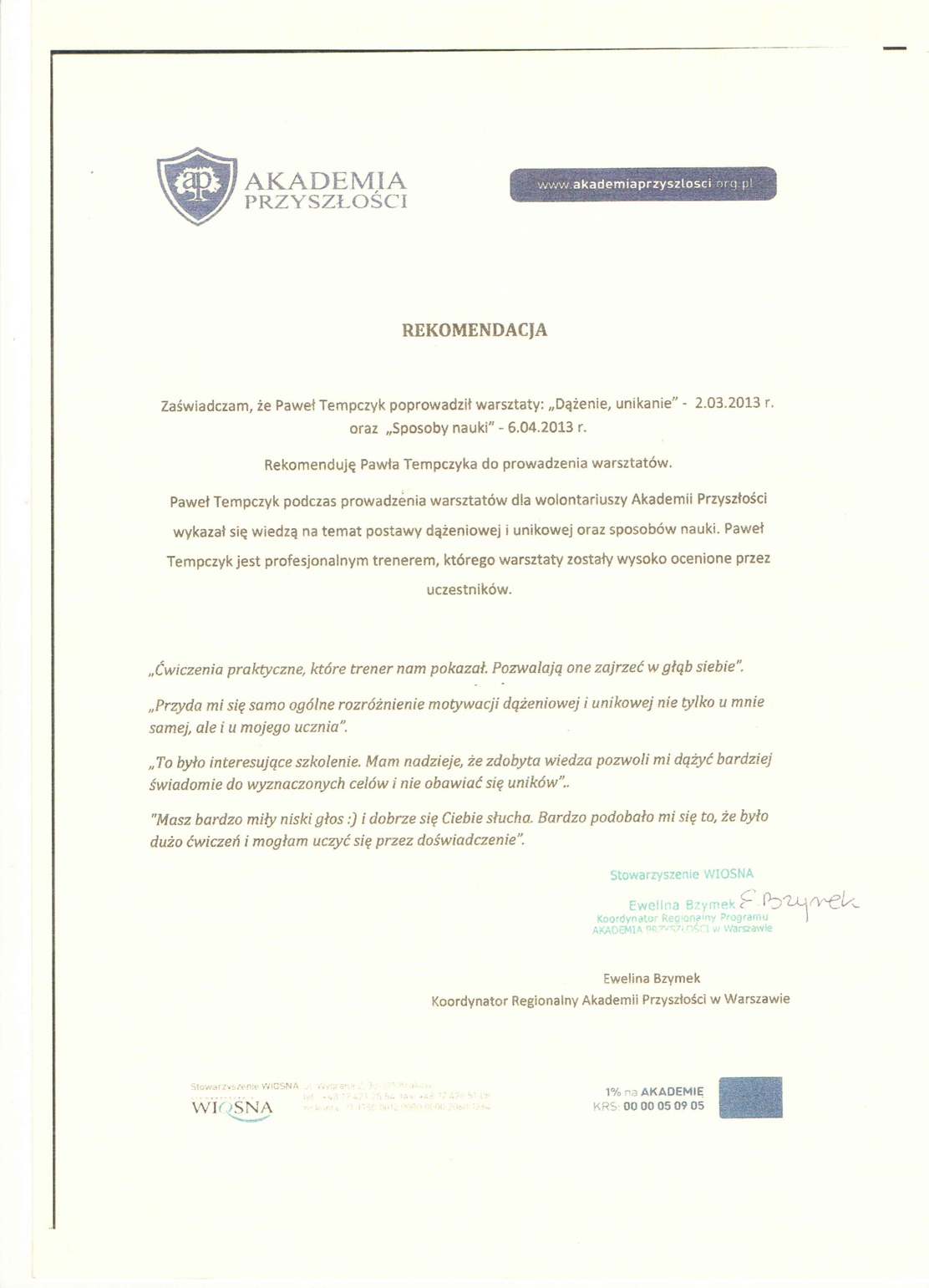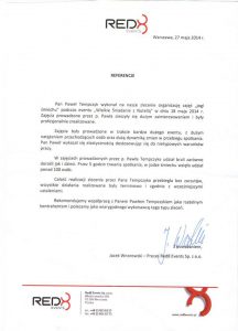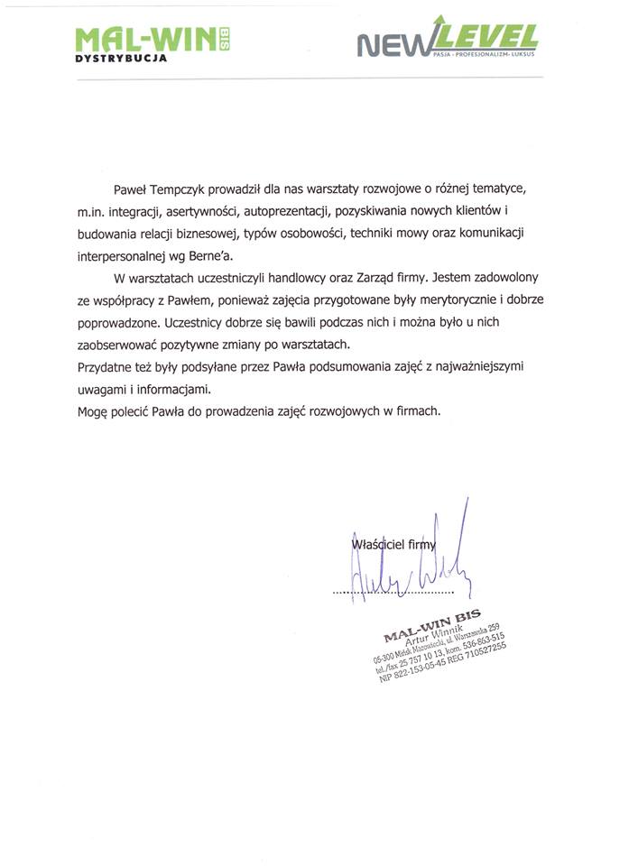 Wybrane rekomendacje Łukasz Rodek – Fundacja Kronenberga przy CITI Handlowym Jarosław Łukjańczuk – Euro-konsulting Ewelina Bzymek – Stowarzyszenie WIOSNA Zespół Towarzystwa Inicjatyw Twórczych Ę dr Oksana Dąbrowska – Fundacja Dobra Wioska Joanna Piotrowska – BlaBlaCar Jacek Jakubowski – Grupa TROP Joanna Piotrowska – BlaBlaCar Jacek Wnorowski – Red8 Events Artur Winnik – Mal-Win Bis dr Natalia Banasik-Jemielniak – Akademia Pedagogiki Specjalnej Djilali Kabeche – AMSED (Association Migration Solidarite et Echanges pour le Developpement) prof. dr hab. Łukasz Sułkowski – PCG Polska prof. dr hab. Grzegorz Chrapkiewicz – Akademia Teatralna dr hab. Zbigniew Kadłubek – Biblioteka Śląska dr Małgorzata Foryś-Nogala – Akademia Ekonomiczno-Humanistyczna Kancelaria Doradcza Progressio – Przemysław Kuderczak Pomiędzy Słowami – Grzegorz Tomaszewski Fundacja Wspierania Dialogu „Rozmawiajmy” – Wiceprezeska Iwona Kozieja-Grabowska Wybrane certyfikaty Kurs Dramy Stosowanej – Stowarzyszenie Praktyków Dramy STOP-KLATKA Kurs coachingu grupowego – Grupa TROP Kurs liderów jogi śmiechu – Laughter Yoga International Kurs diagnostów PERSO.IN Bootcamp Data Science – kodołamacz.pl Kurs moderatorów Design Thinking – Irek Piętowski
